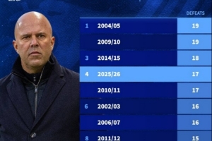 本世纪利物浦单赛季输球场次榜:最多19场,本赛季已17场排第四